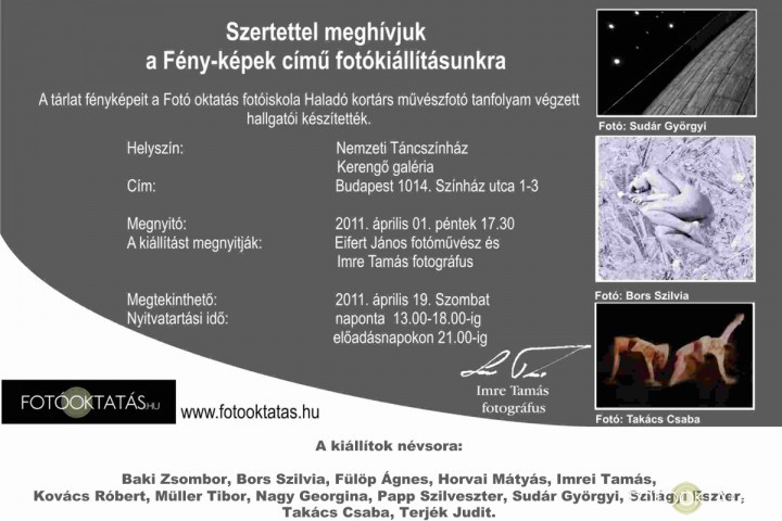 Kortárs Alkotó fotográfus kiállításFény-Képek címmel 2011. április 1-én 17:30-kor nyílik meg a Nemzeti Táncszínház Kerengő Galériában a kiállításunk.